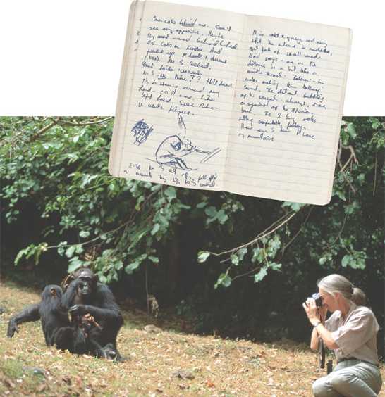 Jane Goodall recorded her observations on chimpanzee behavior in field notebooks, often with sketches.
