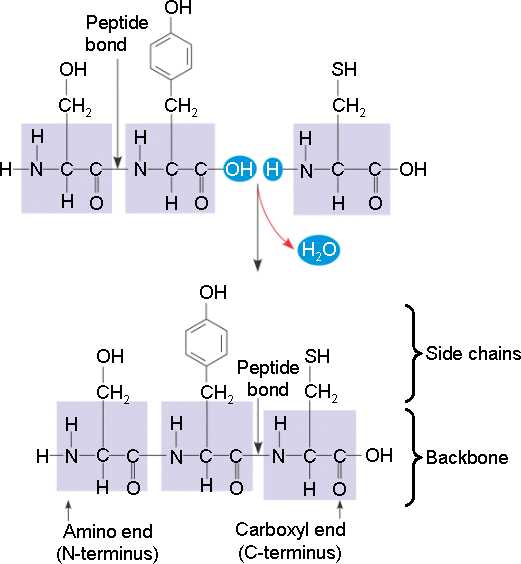 Peptide bonds formed by dehydration reactions link the carboxyl group of one amino acid to the amino group of the next.