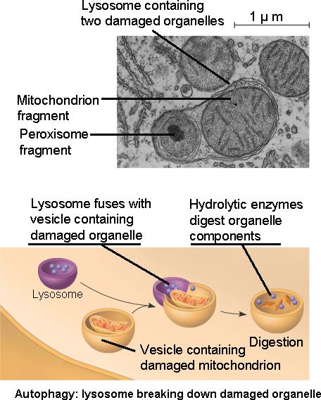 Top: a lysosome engulfs 2 disabled organelles, a mitochondrion and a peroxisome. Bottom: a lysosome fuses with a vesicle containing a damaged mitochondrion.