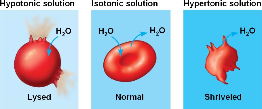 | In a hypotonic environment, water moves into a cell, causing it to lyse (burst) unless it can offset the uptake of water. | An animal cell fares best in an isotonic environment where there is no net water movement. | In a hypertonic environment, water tends to move out of an animal cell, causing it to shrink. | ||