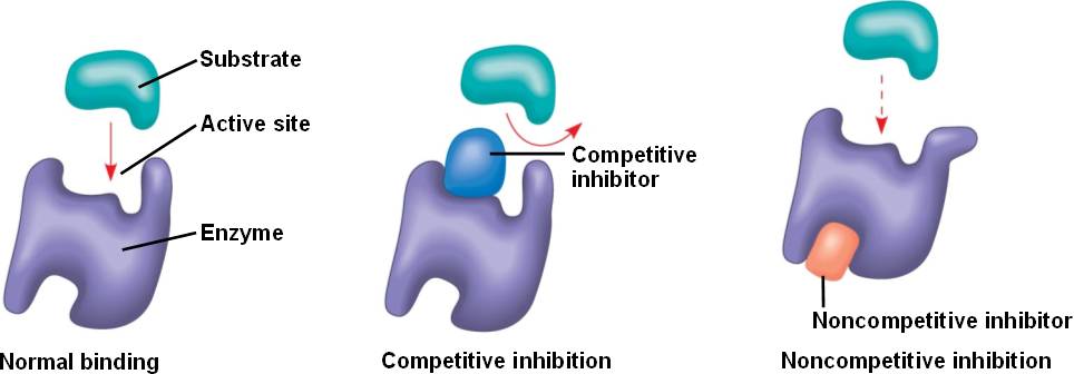 | A substrate binding at the protein's active site activates the enzyme. | In competitive inhibition, the inhibitor interferes with the active site of the enzyme. | In noncompetitive inhibition, the inhibitor binds elsewhere on the protein, changing the shape (conformation) of the active site. | ||