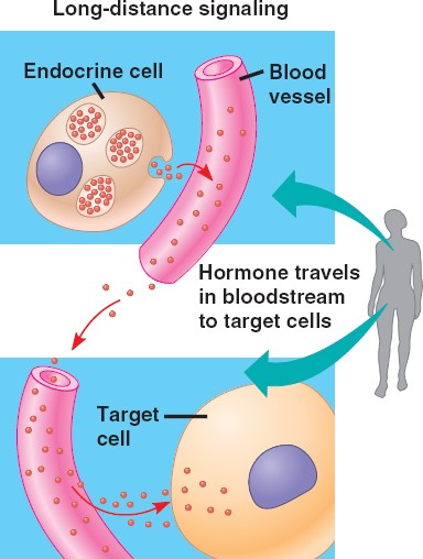 Hormones then travel long distances via vessels to distant target cells.