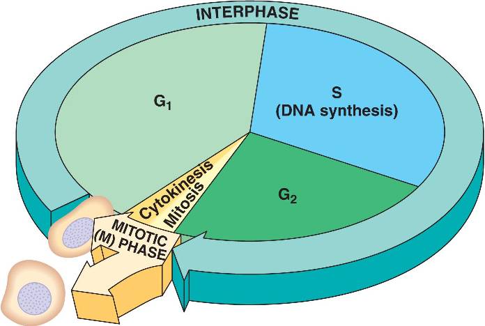 The mitotic (M) phase alternates with interphase, which is composed of 2 growth phases (G1 and G2) and a S (DNA synthesis) phase.