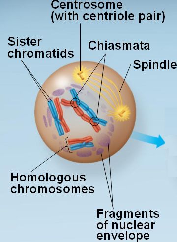 Crossing over of DNA segments occurs at chiasmata between non-sister chromatids, and genetic information is exchanged between the homologues.