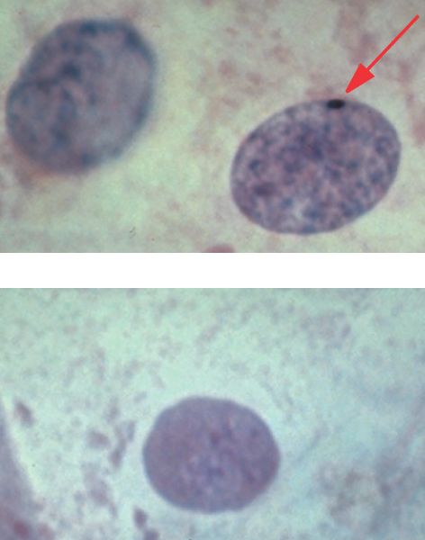 In mammalian females, one of the two X chromosomes in somatic cells is randomly inactivated during development as a compact Barr body.