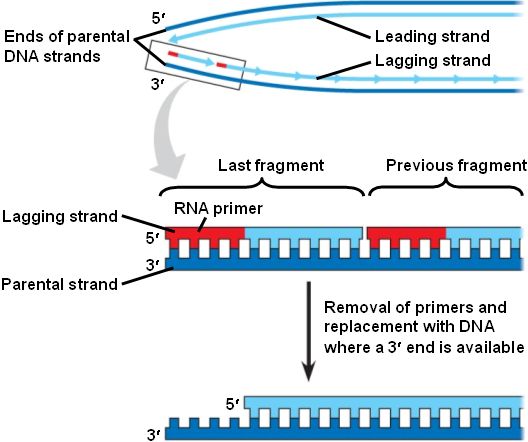 DNA polymerase III cannot complete the 5' end on the new lagging strand.