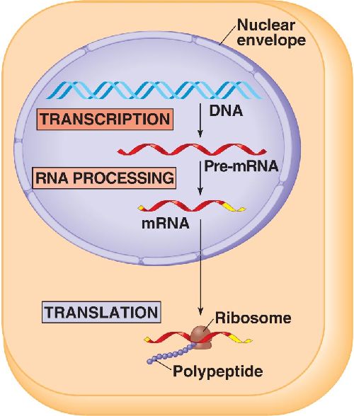 The initial RNA transcript (pre-mRNA) is processed before leaving the nucleus as mRNA.