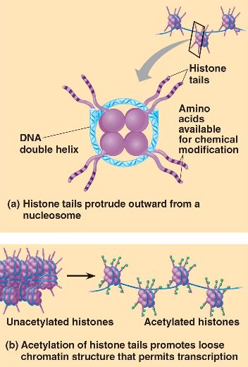 Enzymes can add negative acetyl groups (-COCH3) to histone tails.