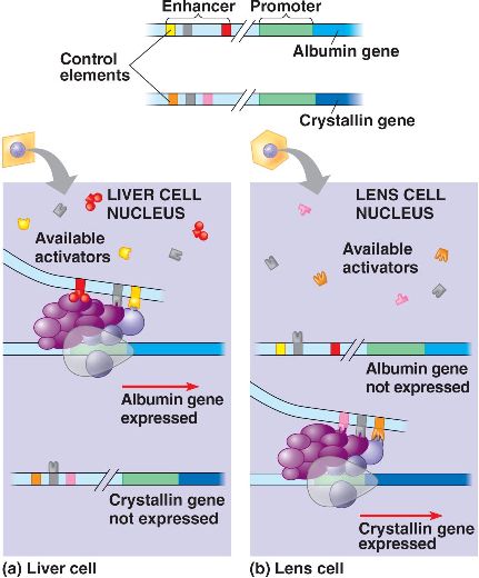 The combination of enhancers and activator proteins enables a liver cell to express the albumin gene, while a lens cell expresses the crystallin gene.