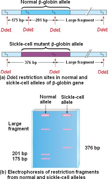 The normal allele of the beta-globin gene, which produces a subunit for hemoglobin, has two sites recognized by the Dde I restriction enzyme, yielding three restriction fragments.