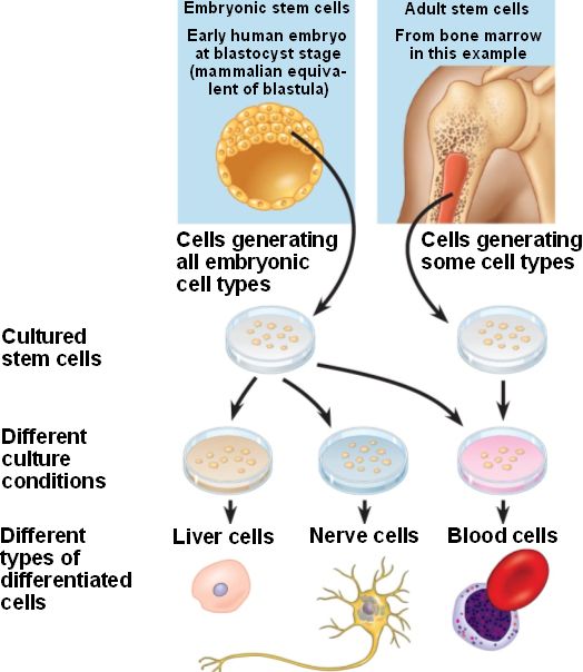 Adult stem cells harvested from tissues (such as bone marrow) are pluripotent, able to give rise to a few cell types.