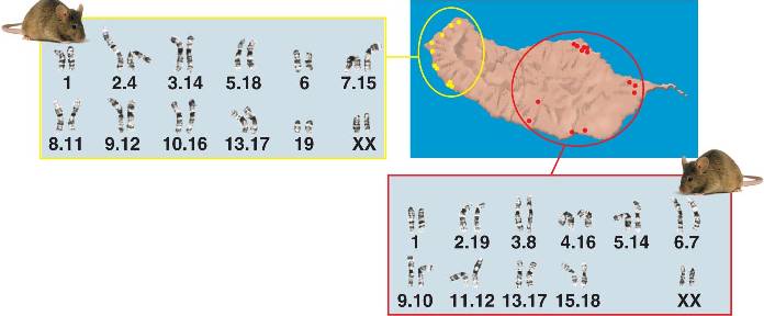 These 2 isolated populations of mice on the island of Madeira exhibit different patterns of fused chromosomes.