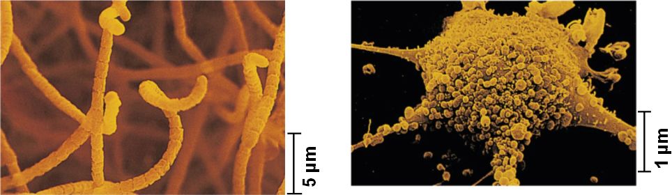 | Gram-Positive Bacteria | Soil-dwelling Streptomyces are a source of many antibiotics, including streptomycin used to treat tuberculosis, which is caused by another gram-positive bacterium, Mycobacterium tuberculosis | Mycoplasmas are tiny and have no cell walls. One species causes "walking pneumonia". Hundreds of mycoplasmas are seen here covering a human fibroblast cell. |