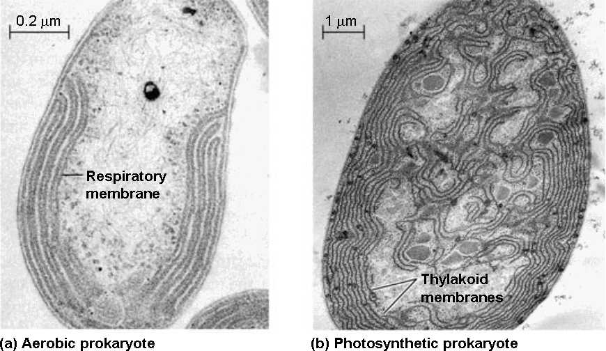 | In-foldings of the plasma membrane, reminiscent of the cristae of mitochondria, function in cellular respiration in some aerobic prokaryotes. | Photosynthetic prokaryotes called cyanobacteria have thylakoid membranes, much like those in chloroplasts. | |