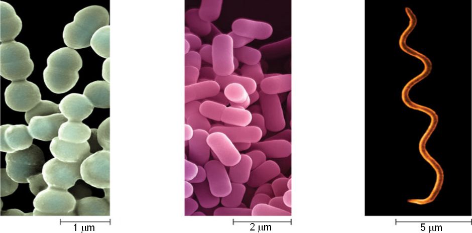 | Cocci (singular coccus) are spherical prokaryotes. They occur singly, in pairs, or in chains (such as these streptococci). | Bacilli (singular, bacillus) are rod-shaped prokaryotes. They are usually solitary, sometimes the rods are arranged in chains. | Spiral prokaryotes such as these spirochetes are corkscrew-shaped. |