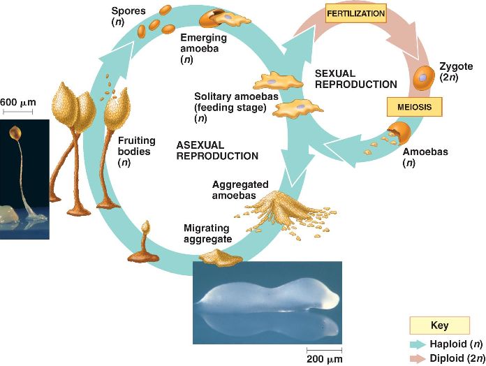 A cellular slime mold can live as unicellular amoebae, but can aggregate to form a multicellular pseudoplasmodium, or "slug", in the haploid stage.